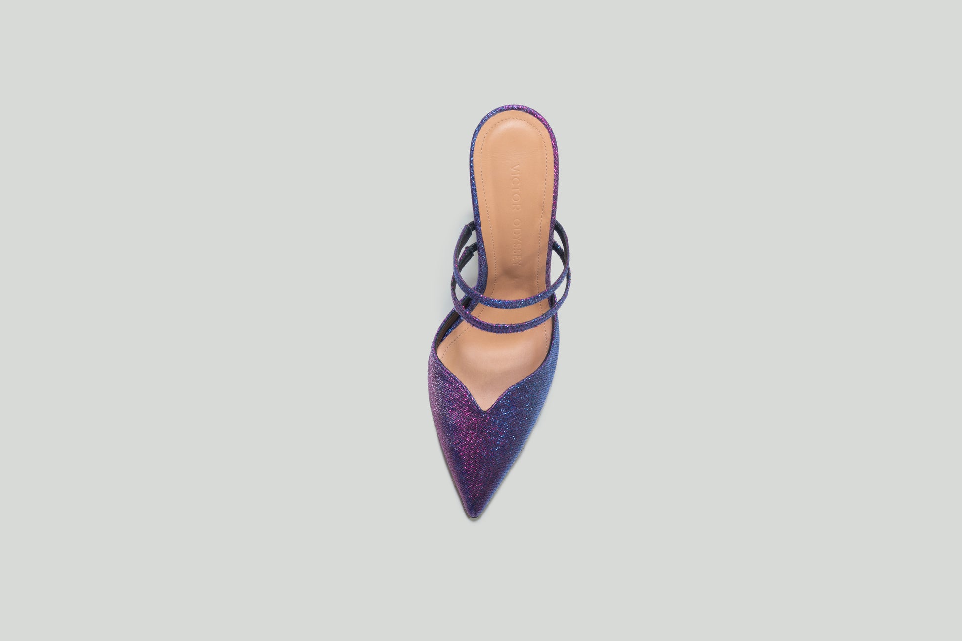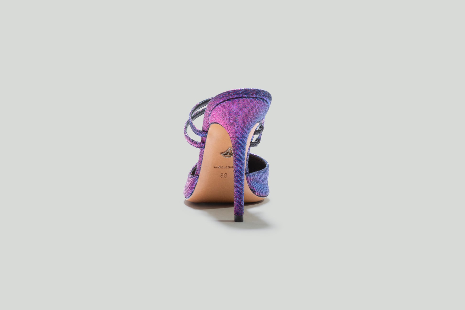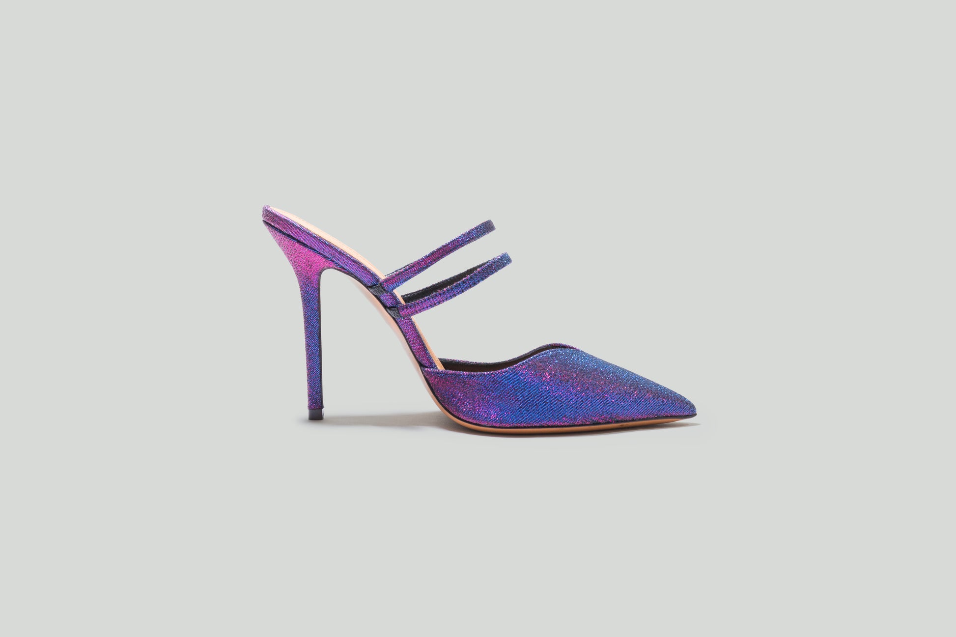 Iridescent mule executed in jacquard fabric, featuring a snout-shaped vamp and double foot-waist straps. The heel includes a 4" heel extension.
